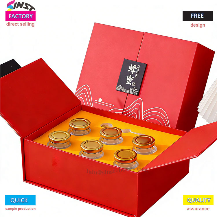Ang red gold Honey gift box na ito na binuo sa shock-absorbing lining ay maaaring maayos na ayusin ang glass honey jar at maiwasan ang mga banggaan sa transportasyon. Ang kahon ng regalo ng pulot ay angkop para sa lahat ng okasyon, kabilang ang mga pagbisita sa negosyo, mga regalo sa holiday, at mga souvenir, at sumusuporta sa pagpapasadya ng logo. Isa man itong lata ng high-end na honey o kumbinasyon ng maraming lata ng honey, madali itong dalhin, na ginagawa itong isang cost-effective na pagpipilian para sa mga dayuhang mangangalakal na pataasin ang mga premium ng produkto.