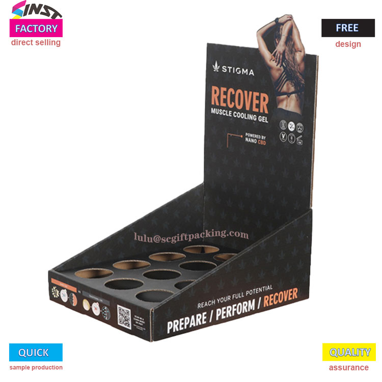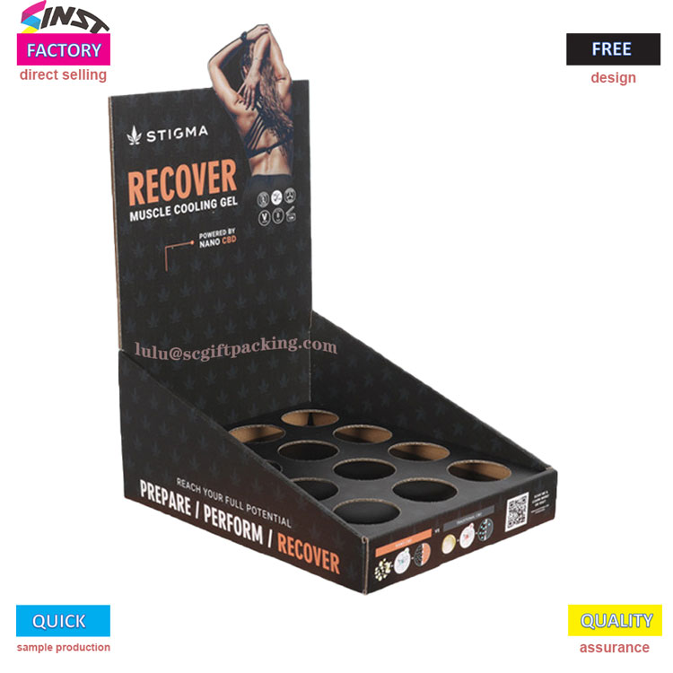 Ang kahon ng pagpapakita ng produktong pangkalusugan na may walang laman na papel ng espasyo ay nagtatampok ng isang minimalist na aesthetic na may itim na background na mainit na panlililak at isang malakas na visual na epekto, na itinampok ang pangunahing pagbebenta ng punto ng pag -relaks ng kalamnan pagkatapos ng ehersisyo. Ang display rack ay nagpatibay ng isang multi grid circular hole storage design, na hindi lamang nagpapatatag ng display ngunit inilalabas din ang texture ng mga produkto,