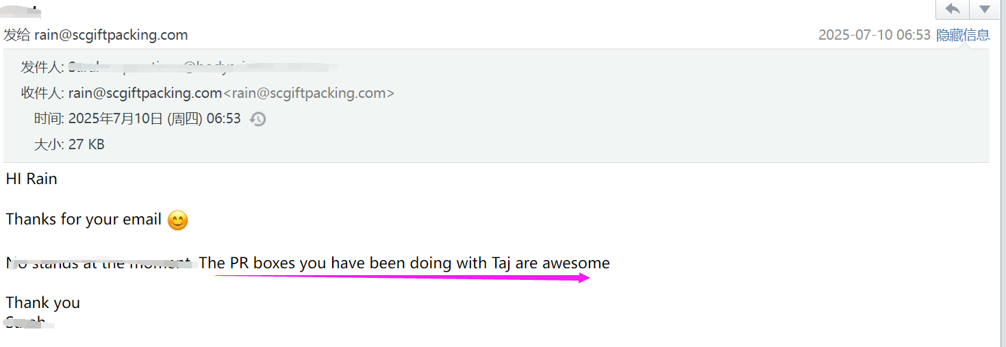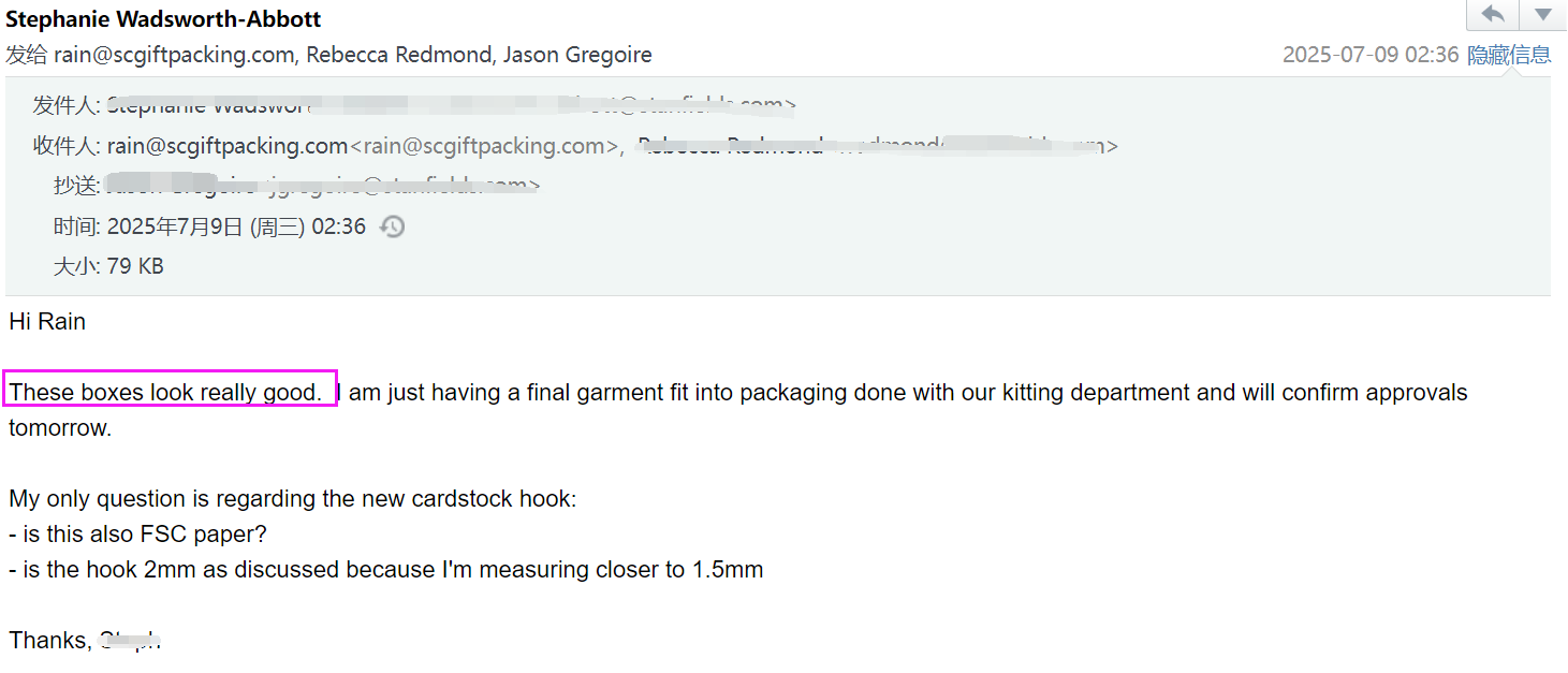 Natapos lang ni Emily ang isang pangkat ng mga order ng kahon ng regalo noong nakaraang linggo. Sinabi niya, "Ang kailangan natin ay hindi ordinaryong mga kahon, ngunit ang 'mga produktong social media' na maaaring gumawa ng mga puso ng mga mamimili ng isang sulyap." Ang pangwakas na pagkakasunud -sunod ay nadagdagan ng 30%, at nag -email din siya ng isang tala na nagsasabing, "Para sa koleksyon ng tagsibol sa susunod na taon, isinasaalang -alang lamang namin ang iyong pagiging produktibo sa disenyo