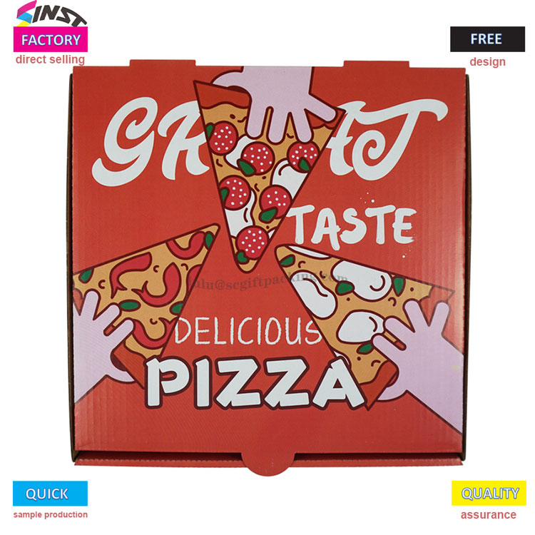 Ito ay isang pulang makapal na cowhide pizza corrugated box, na may mga kamay ng cartoon na may hawak na hiwa ng pizza na may iba't ibang mga pagpuno na nakalimbag sa kahon, maliwanag sa kulay. Ang gilid ng kahon ay nilagyan ng mga butas ng tambutso, na hindi lamang matiyak na ang pizza ay hindi nasira ngunit nagsisilbi rin sa layunin ng pangangalaga;