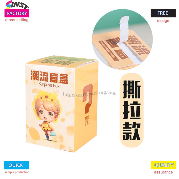 Ang laki ng Oftrendy Doll Blind Box Tear Off Card Box ay maaaring ipasadya ayon sa mga pangangailangan ng customer. Sa kasalukuyan, ang mga laki ng kahon ay: 6 * 6 * 10cm; 10 * 10 * 15cm; Ang kahon na ito ay maaaring gumamit ng pag-print ng high-definition at na-import na tinta,